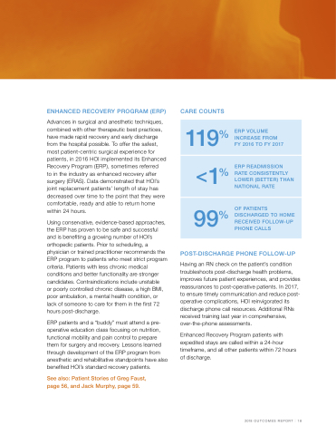 Having an RN check on the patient’s condition troubleshoots post-discharge health problems, improves future patient experiences, and provides reassurances to post-operative patients. In 2017, to ensure timely communication and reduce post- operative complications, HOI reinvigorated its discharge phone call resources. Additional RNs received training last year in comprehensive, over-the-phone assessments.