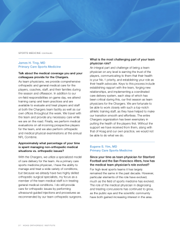 An integral part and challenge of being a team physician on any level is earning the trust of the players, communicating to them that their health is your No. 1 priority, and establishing your role as their health advocate. Keys to this process include establishing rapport with the team, forging new relationships, and implementing a coordinated care delivery system, each step of which has been critical during this, our first season as team physicians for the Chargers. We are fortunate to be able to work closely with such a top-notch athletic training staff, as they have helped to make our transition smooth and effortless. The entire Chargers organization has been exemplary in putting the health of the players first. Without the support we have received from them, along with that of Hoag and our own practice, we would not be able to do what we do.
