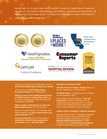 “FROM CMS TO US NEWS AND WORLD REPORT, PUNDITS CONSISTENTLY RANK HOI AS ONE OF THE HIGHEST PERFORMING ORTHOPEDIC PROVIDERS IN THE NATION. WE ARE RELENTLESS IN OUR QUEST TO EXCEL IN DOING WHAT’S RIGHT FOR PATIENTS.”