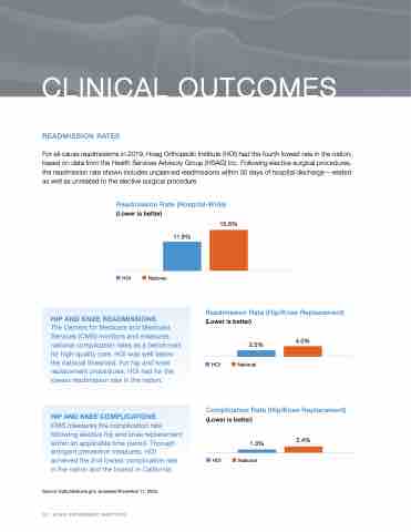 For all-cause readmissions in 2019, Hoag Orthopedic Institute (HOI) had the fourth lowest rate in the nation, based on data from the Health Services Advisory Group (HSAG) Inc. Following elective surgical procedures, the readmission rate shown includes unplanned readmissions within 30 days of hospital discharge – related as well as unrelated to the elective surgical procedure.
