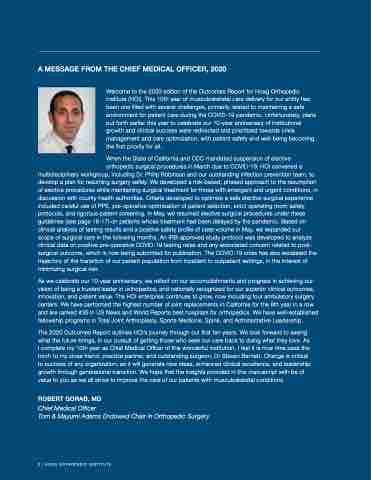 orthopedic surgical procedures in March due to COVID-19, HOI convened a multidisciplinary workgroup, including Dr. Philip Robinson and our outstanding infection prevention team, to develop a plan for resuming surgery safely. We developed a risk-based, phased approach to the resumption of elective procedures while maintaining surgical treatment for those with emergent and urgent conditions, in discussion with county health authorities. Criteria developed to optimize a safe elective surgical experience included careful use of PPE, pre-operative optimization of patient selection, strict operating room safety protocols, and rigorous patient screening. In May, we resumed elective surgical procedures under these guidelines (see page 16-17) on patients whose treatment had been delayed by the pandemic. Based on clinical analysis of testing results and a positive safety profile of case volume in May, we expanded our scope of surgical care in the following months. An IRB-approved study protocol was developed to analyze clinical data on positive pre-operative COVID-19 testing rates and any associated concern related to post- surgical outcome, which is now being submitted for publication. The COVID-19 crisis has also escalated the trajectory of the transition of our patient population from inpatient to outpatient settings, in the interest of minimizing surgical risk.