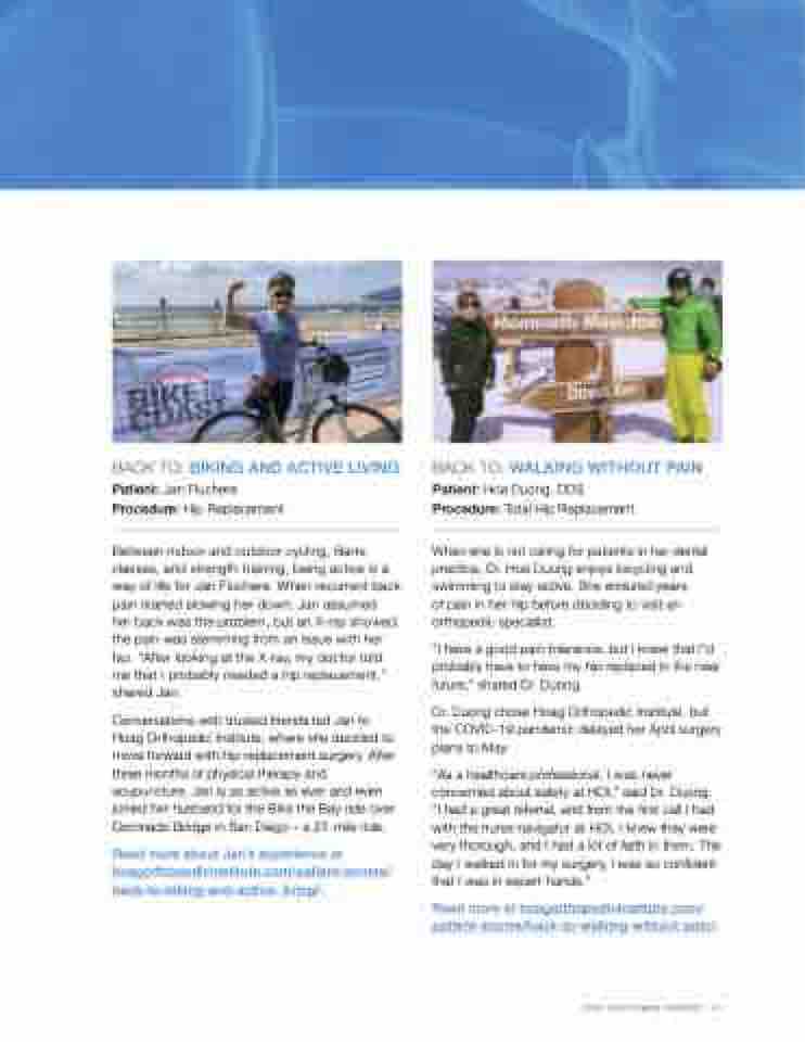 Read more about Jan’s experience at hoagorthopedicinstitute.com/patient-stories/ back-to-biking-and-active- living/.